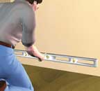 After all the wall cabinets are in place, install the corner or end base cabinet. If necessary, use shims to level it and raise it up to the high point of the floor, so its upper edge aligns with the line on the wall. Be sure it is level from front to back and from side to side, then screw it to the wall studs. |