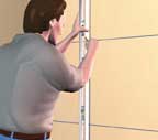 Use a stud finder to locate the wall studs, then, with a pencil, mark their locations above and at least 6 inches below the mark you've made for the bottom of the wall cabinets. Draw straight vertical lines between the top and bottom marks to indicate the center of the studs. |