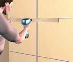 Screw a temporary 1-by-3 support rail to the wall, aligning the top edge of the rail with the line for the bottom edge of the wall cabinets. Attach it by driving three or four 2-inch screws through the rail into the wall studs. |