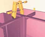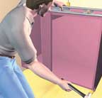 To turn a corner with base cabinets, push the adjoining cabinet in place and clamp the two units together. Add a filler strip if needed to allow doors and drawers clearance. If necessary, tap shims under the cabinet and behind it to adjust for plumb and level. |