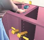 With frameless cabinets, drill bolt holes through shelf-peg holes, then bolt the two together. Be sure not to fasten through shelf-peg holes that you will need for shelves. |